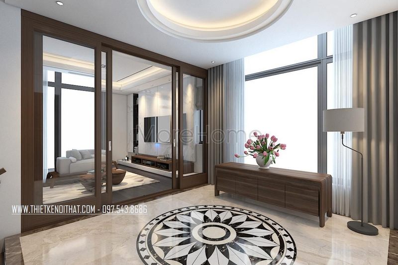 Mẫu cửa kính khung gỗ óc chó được thiết kế theo dạng lùa hiện đại, giúp tiết kiệm tối đa diện tích cho cả không gian căn phòng